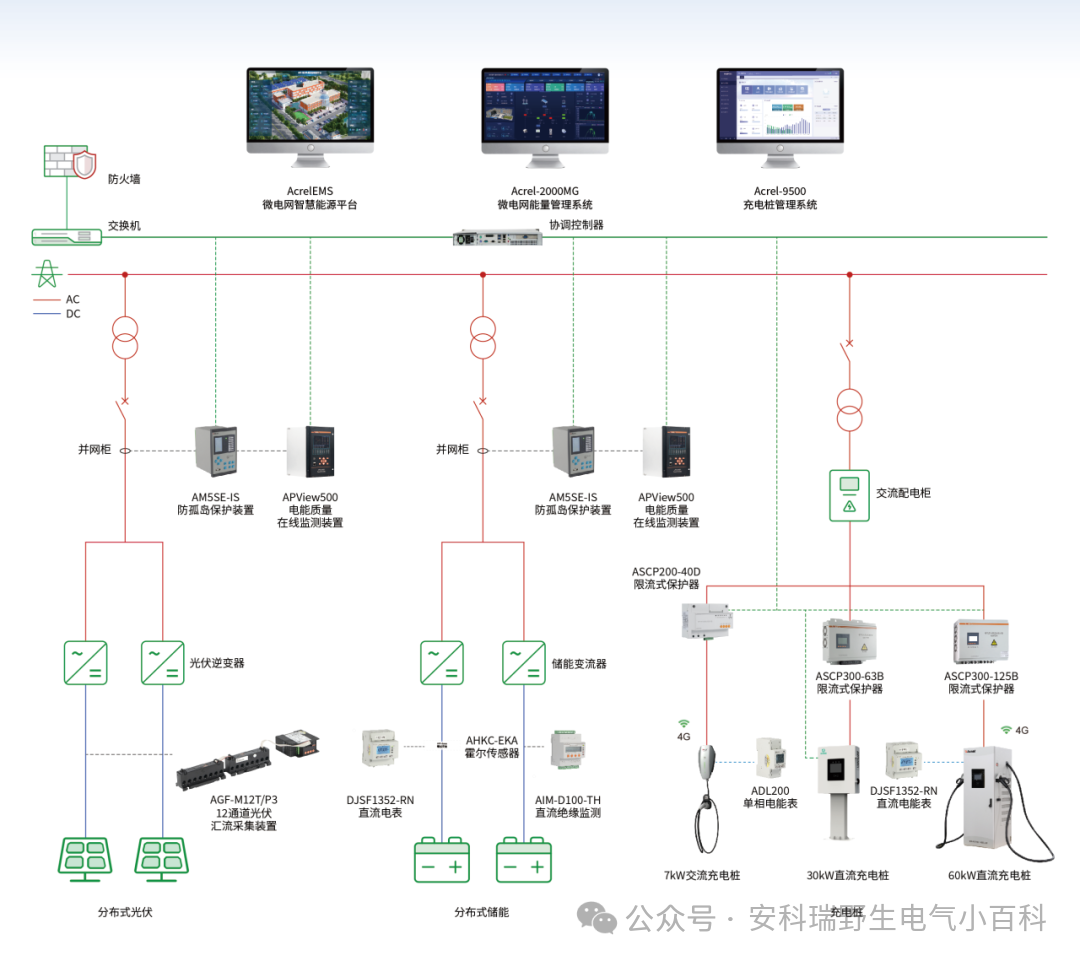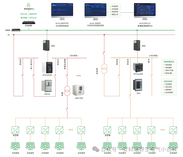 借助 AcrelEMS 智慧能源管理平臺,可對用戶微電網(wǎng)的光伏發(fā)電系統(tǒng)以及用電負(fù)荷 展開實(shí)時(shí)監(jiān)測。結(jié)合先進(jìn)的光伏預(yù)測技術(shù),該平臺能夠優(yōu)化運(yùn)行策略,實(shí)現(xiàn)源荷之間的 有序互動(dòng)。不僅可以靈活調(diào)節(jié)逆變器出力,有效避免逆流現(xiàn)象,還能充分滿足企業(yè)微電 網(wǎng)在能效管理數(shù)字化、安全分析智能化等方面的需求,顯著提高微電網(wǎng)的運(yùn)行效率和能 源利用率。