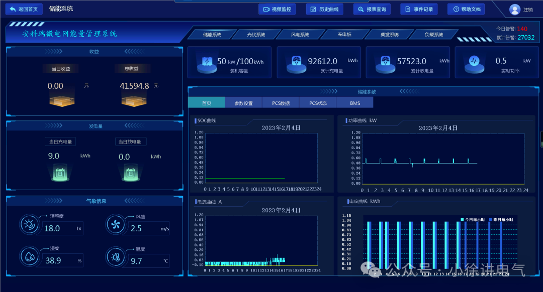 儲能管理也是該系統的一大特色。系統對儲能系統的充放電過程進行精細化管理,根據儲能設備的狀態和電網需求,智能制定充放電策略。在光伏發電充足時,系統控制儲能系統充電,將多余的電能儲存起來;當光伏發電不足或企業用電負荷增加時,儲能系統放電,補充電力。系統還具備儲能設備狀態估計與性能評估功能,通過先進的算法對儲能設備的剩余容量、健康程度等進行準確估計,為設備維護和更換提供決策依據 。
