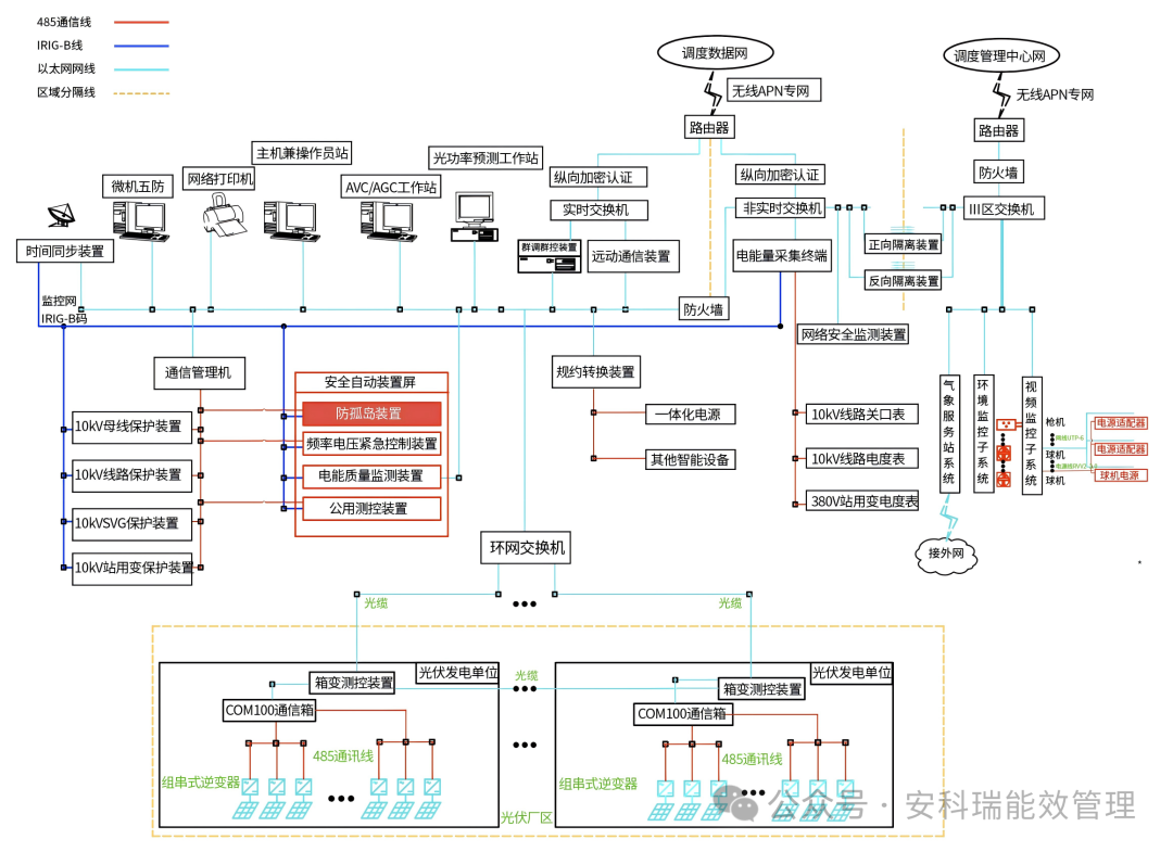 分布式光伏發電監控系統的電力二次部分主要包含繼電保護及安全自動裝置,具體如線路保護裝置、安全自動裝置、防孤島保護裝置、UPS 電源等;為滿足調度自動化要求,需配置遠動系統、對時設備及安全防護裝置;為實現系統電量統計,需配備電能計量裝置,包括關口計量表、并網電能表、自用電計量電能表及采集終端等;為保障并網電能質量達標,需配置電能質量監測裝置;同時,還需搭建覆蓋整個光伏系統的通信設備,以滿足系統互聯互通與可管理性需求。