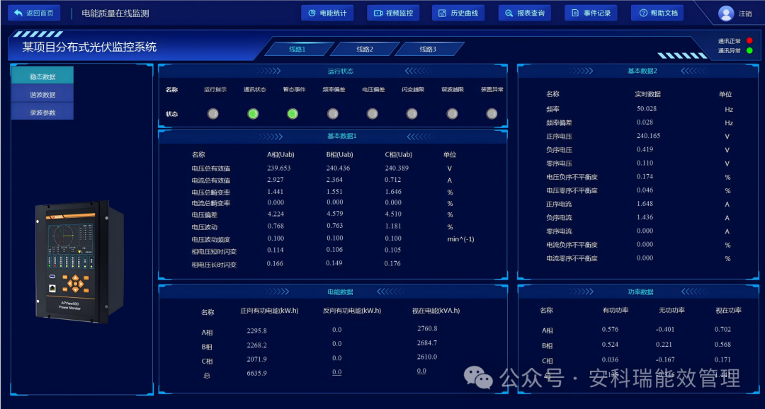 通過曲線圖展示三相電流/電壓諧波數據、實時負荷曲線、有效值/波動/偏差/閃變等參數;