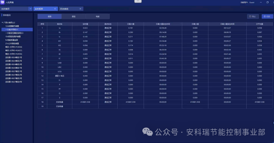 在實(shí)時(shí)報(bào)表監(jiān)測界面中,用戶可以根據(jù)需求直接選擇所想要查看數(shù)據(jù)的設(shè)備,能查詢各回路或設(shè)備實(shí)時(shí)的運(yùn)行參數(shù),報(bào)表中顯示的電參量信息應(yīng)包括:各相電流、三相電壓、總功率因數(shù)、總有功功率、總無功功率、電能,遙信量等。遙測量包括實(shí)時(shí)值(處于不同狀態(tài)時(shí)應(yīng)給以不同顏色區(qū)分)、測點(diǎn)狀態(tài)(越限、置入、通信異常等)、日平均值等。遙信量包括實(shí)時(shí)值(處于不同狀態(tài)時(shí)應(yīng)給以不同顏色區(qū)分)、測點(diǎn)狀態(tài)(置入、通信異常等)、日變位次數(shù)等,報(bào)表可以導(dǎo)出和打印。