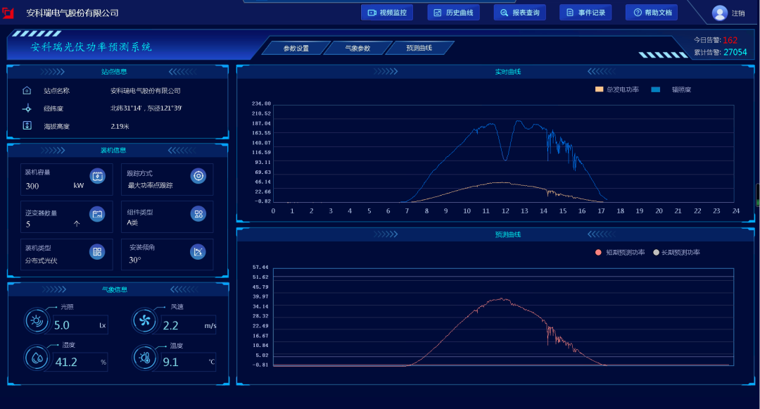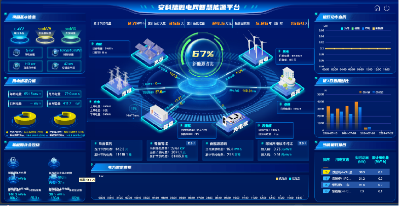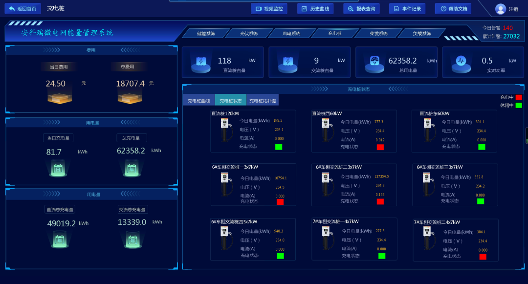 光伏監測/能量管理系統:能量管理系統包含微電網光伏、充電樁及總體負荷情況,體現系統主接線圖、光伏信息、充電樁信息、告警信息、收益、環境等。