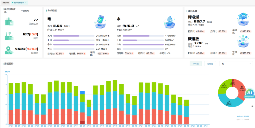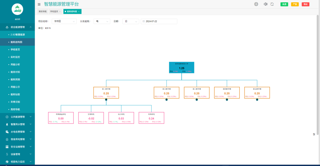 綜合能耗分析:從能耗拓撲、組織拓撲、空間拓撲三個維度對校園能耗進行精準統計和管理,實現智能化與動態化。