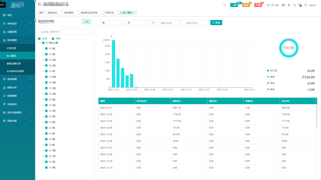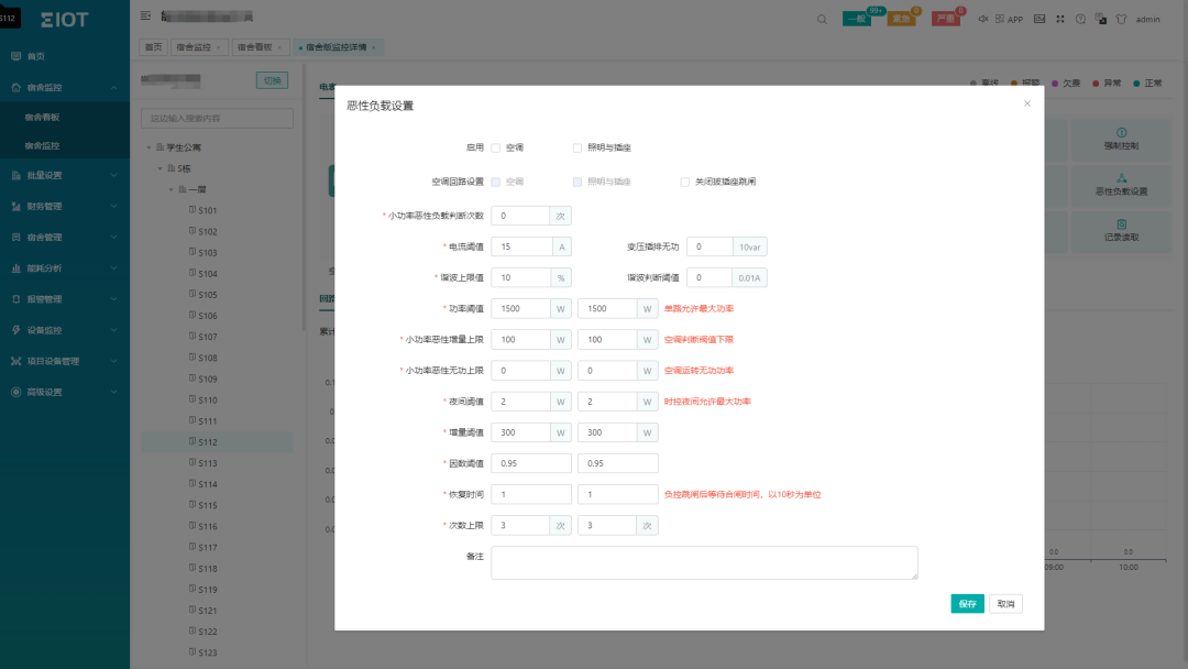 宿舍電控計費系統:對宿舍用電進行精細化計量及控制,單間宿舍可最多進行5路獨立計量控制(違規電器識別、定時通斷),并具有基礎額度設置、跳閘記錄等功能。