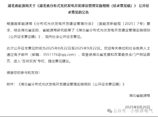 光伏頭條獲悉,8月22日,湖北省能源局發(fā)布關(guān)于《湖北省分布式光伏發(fā)電開發(fā)建設(shè)管理實(shí)施細(xì)則(征求意見稿)》。