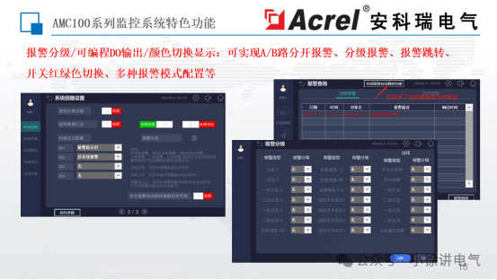 系統支持63次諧波分析、漏電流、零地電壓等監測功能,具備事件記錄與報警分級機制。通過可編程DO輸出與多級報警策略,可實現A/B路獨立報警、顏色切換、聲光提示等,真正做到“聞"故障于未然,防患于未然。