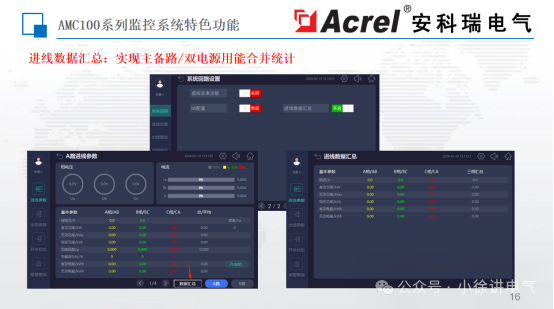 AMC100系列支持實時顯示主備路電流、電壓、功率、諧波等全電參量,實現雙路進線、192路出線的監控。系統具備虛擬電表、接線切換、顏色區分顯示等功能,幫助運維人員直觀掌握配電狀態,實現“一屏掌控全局"。