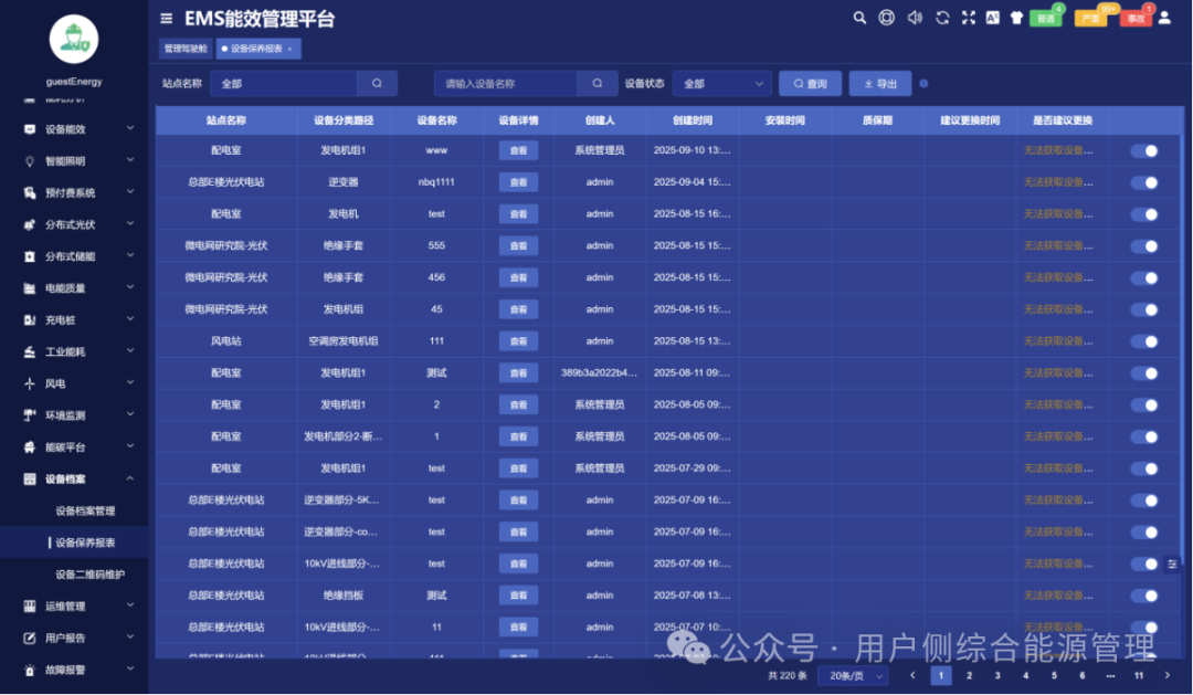 記錄設備運行時長、維護記錄,基于數據評估設備健康狀態。當冷水機組運行滿規定時間時,系統自動生成維保提醒,提示更換濾網;變壓器絕緣老化風險上升時,提前安排檢測,減少突發故障停機時間。