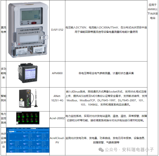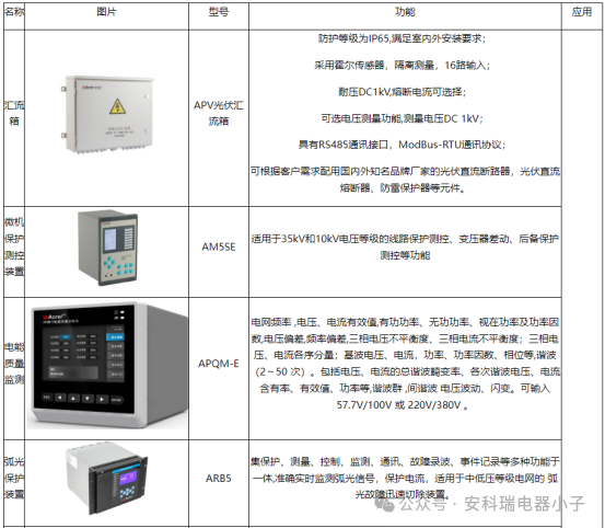上圖為一個1MW分布式光伏電站的示意圖,光伏陣列接入光伏匯流箱,經過直流柜匯流后接入集中式逆變器(直流柜根據(jù)情況可不設置),經過升壓變壓器升壓至10kV或35kV后并入中壓電網(wǎng)。由于光伏電站裝機容量比較大,涉及到的保護和測控設備比較多,主要如下表:
