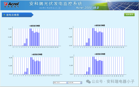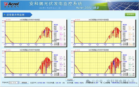 能夠根據(jù)微逆變反應的數(shù)據(jù)顯示各組太陽能電池板的工作狀態(tài)(是否正常發(fā)電),根據(jù)組串式逆變器顯示各光伏組串輸出功率,分別計量兩種兩種逆變方式的發(fā)電量日發(fā)電量、日發(fā)電量曲線、月發(fā)電量柱狀圖、年發(fā)電量柱狀圖等,并對這兩種方式發(fā)電量進行對比。
