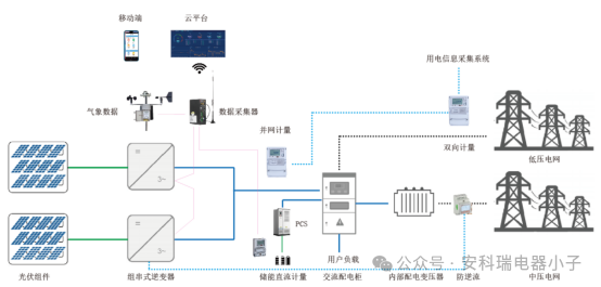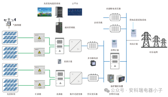 單點并網(wǎng)裝機容量小于6兆瓦的非戶用工商業(yè)分布式光伏,需升壓后并網(wǎng)。供電部門對穩(wěn)控系統(tǒng)、電能質量等要求高,并網(wǎng)點需監(jiān)測電能質量。系統(tǒng)涉及設備多,安科瑞提供APV光伏匯流箱AM5SE微機保護測控裝置等設備及配套解決方案。