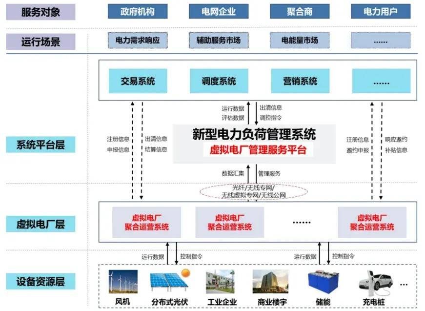 通過信息手段,將廣域可調資源連接,實現了設備數據和互動信息的計算、存儲,具備能源運行管理、交易、輔助服務等功能,整合優化各類分布式資源與營銷系統、調度系統、交易系統交互。