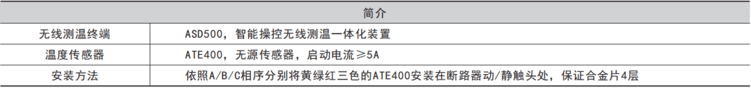 因電壓等級高,可使用無線測溫方案。采用ATE400在斷路器動、靜觸頭處安裝,將采集到的溫度數值,通過無線型號傳輸到ASD500智能操控顯示端。