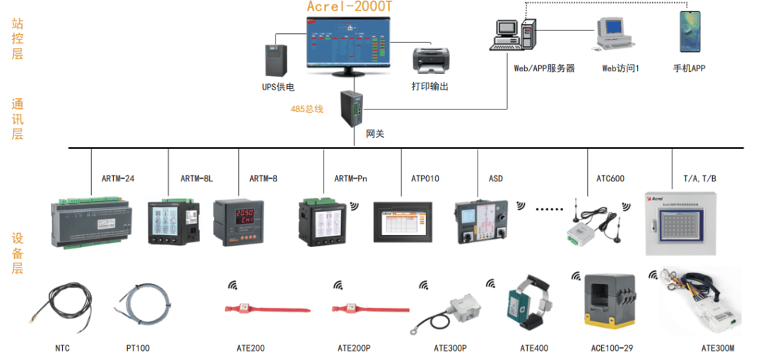 方案架構分為設備層、通訊層、站控層,各層各司其職、協同工作,確保溫度數據的采集與傳輸: